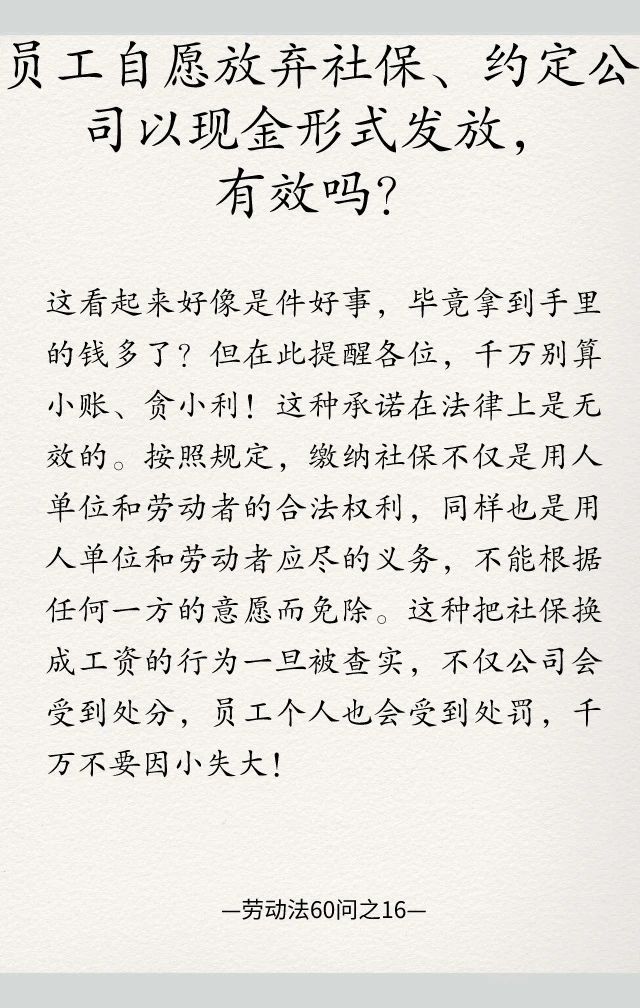 劳动法60问之16|员工自愿放弃社保、约定公司以现金形式发放