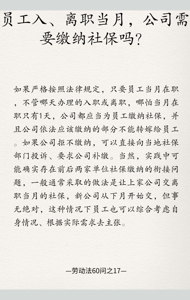 劳动法60问之17|员工入、离职当月,公司需要缴纳社保吗?