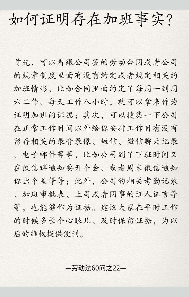 我们可以从以下几个方面入手:首先,可以看跟公司签的劳动合同或者公司的规章制度里面有没有约定或者规定相关的加班情形,比如合同里面约定了每周一到周六工作、每天工作八小时,就可以拿来作为证明加班的证据;其次,可以搜集一下公司在正常工作时间以外给你安排工作时有没有留存相关的录音录像、短信、微信聊天记录、电子邮件等等,比如公司到了下班时间又在微信群通知要开个会、或者周末微信通知你出个差等等;此外,公司的相关考勤记录、加班审批表、上司或者同事的证人证言等等,也能够作为证据。建议大家在平时工作的时候多长个心眼儿、及时保留证据,为以后的维权提供便利。
