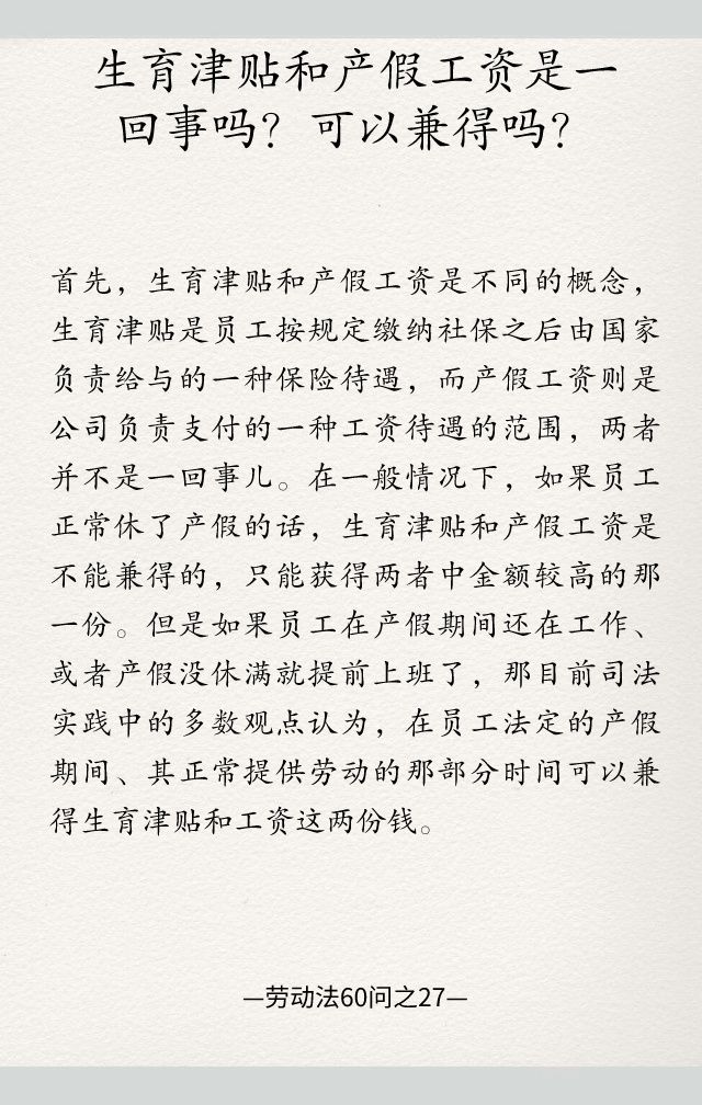 劳动法60问之27|生育津贴和产假工资是一回事吗?可以兼得吗
