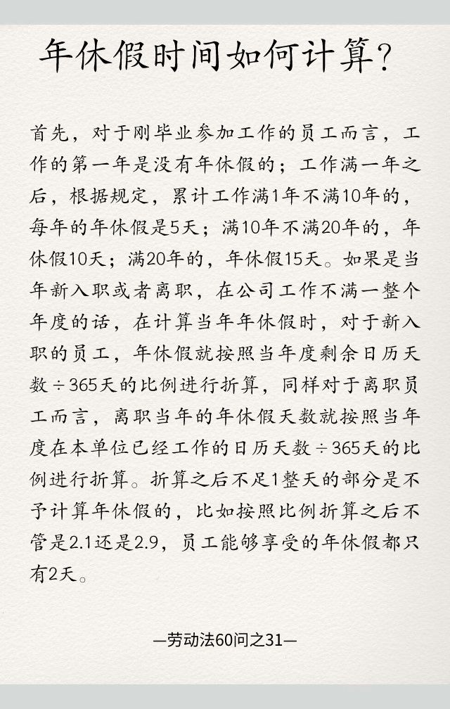 上一期中我们提到了在计算年休假时,员工在不同单位的工作时间要累计计算的问题。那么具体每年能获得的年休假天数应该如何计算呢?首先,对于刚毕业参加工作的员工而言,工作的第一年是没有年休假的;工作满一年之后,根据规定,累计工作满1年不满10年的,每年的年休假是5天;满10年不满20年的,年休假10天;满20年的,年休假15天。如果是当年新入职或者离职,在公司工作不满一整个年度的话,在计算当年年休假时,对于新入职的员工,年休假就按照当年度剩余日历天数÷365天的比例进行折算,同样对于离职员工而言,离职当年的年休假天数就按照当年度在本单位已经工作的日历天数÷365天的比例进行折算。折算之后不足1整天的部分是不予计算年休假的,比如按照比例折算之后不管是2.1还是2.9,员工能够享受的年休假都只有2天。