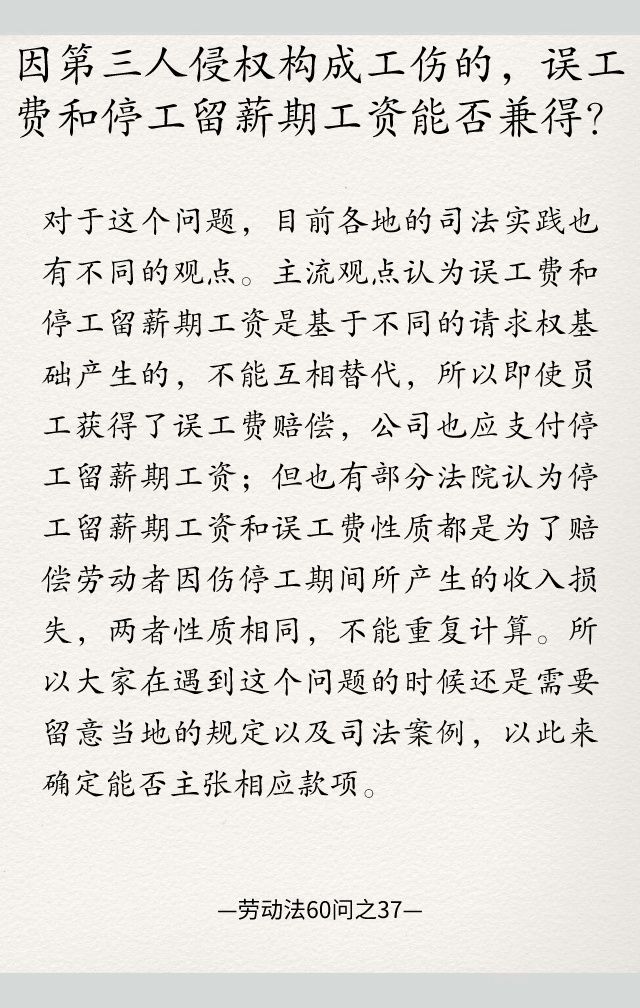 劳动法60问之37|因第三人侵权构成工伤的,误工费和停工留薪