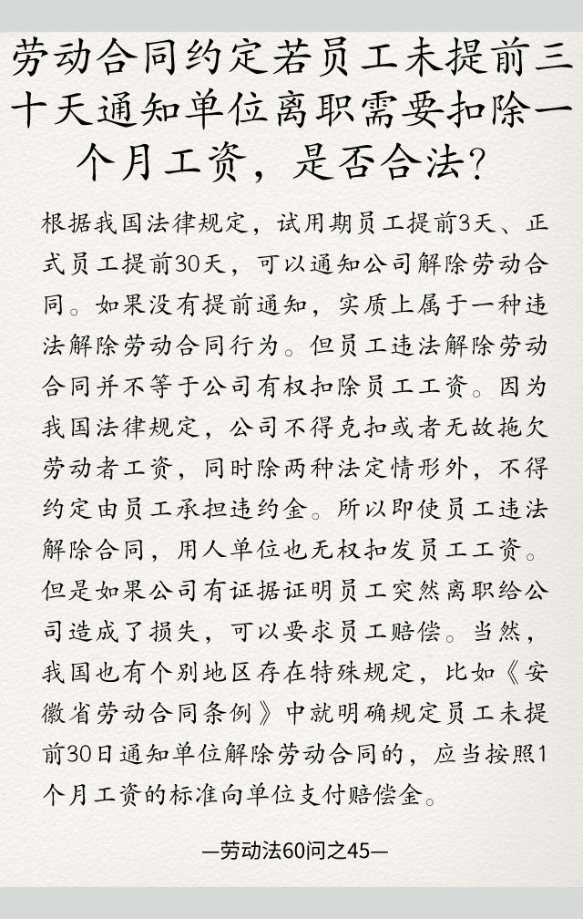 劳动法60问之45|劳动合同约定若员工未提前三十天通知单位离