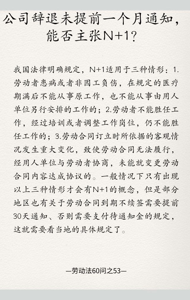 劳动法60问之53|公司辞退未提前一个月通知,能否主张N+1