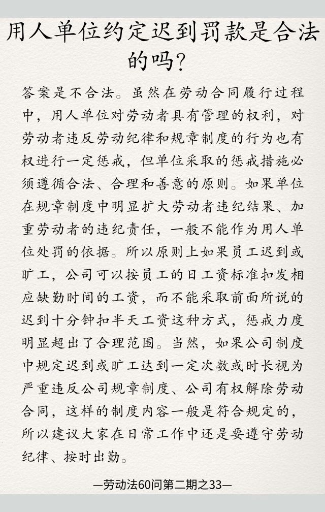 劳动法60问第二期之33|用人单位约定迟到罚款是合法的吗?