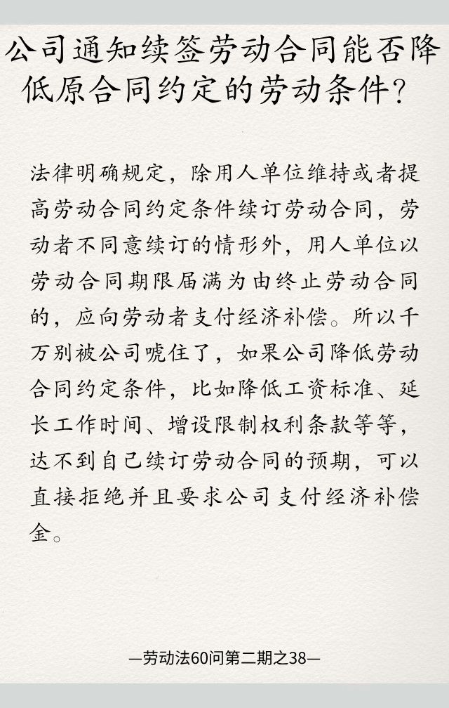 劳动法60问第二期之38|公司通知续签劳动合同能否降低原合同
