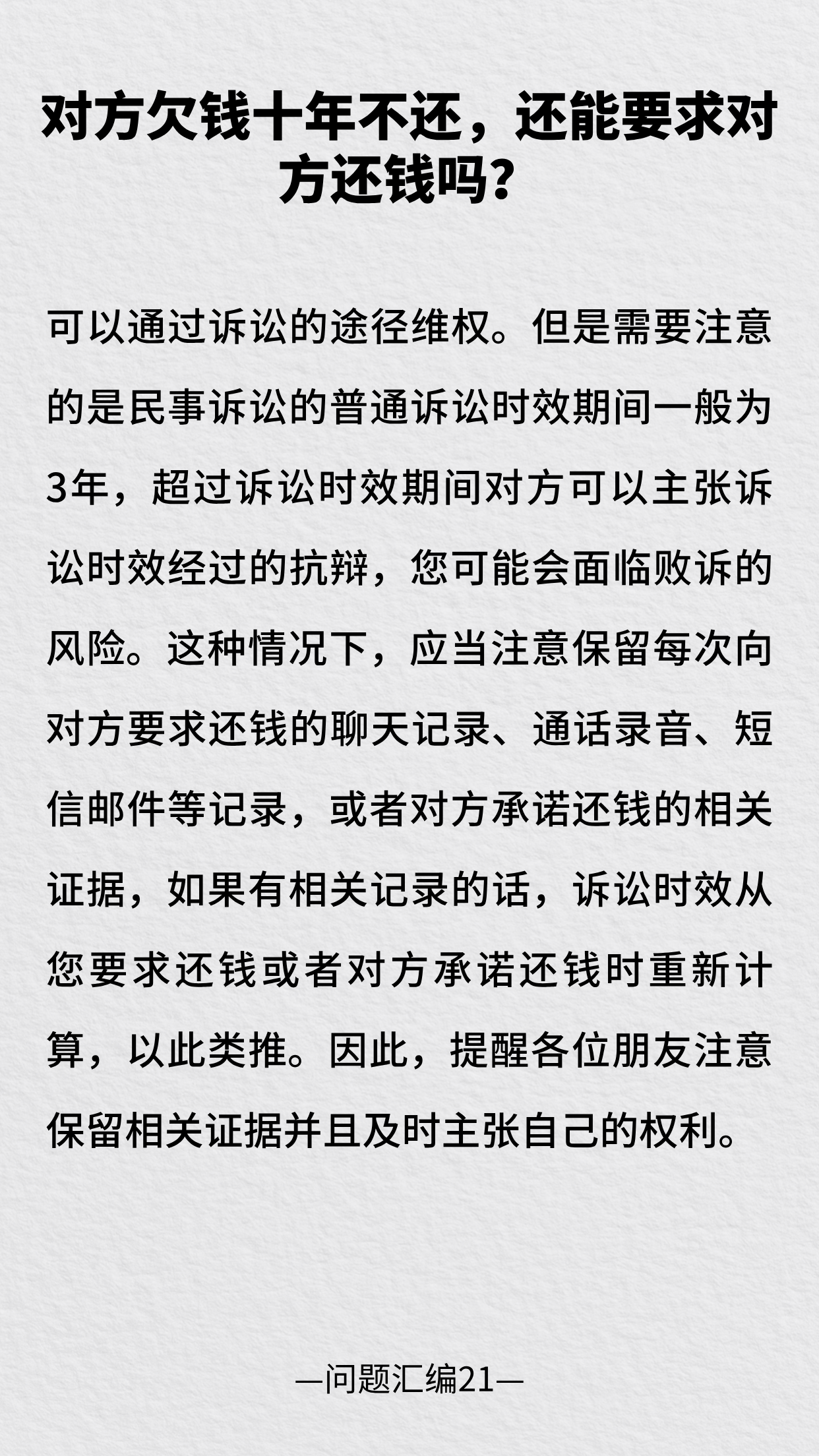 问题汇编21|对方欠钱十年不还,还能要求对方还钱吗?
