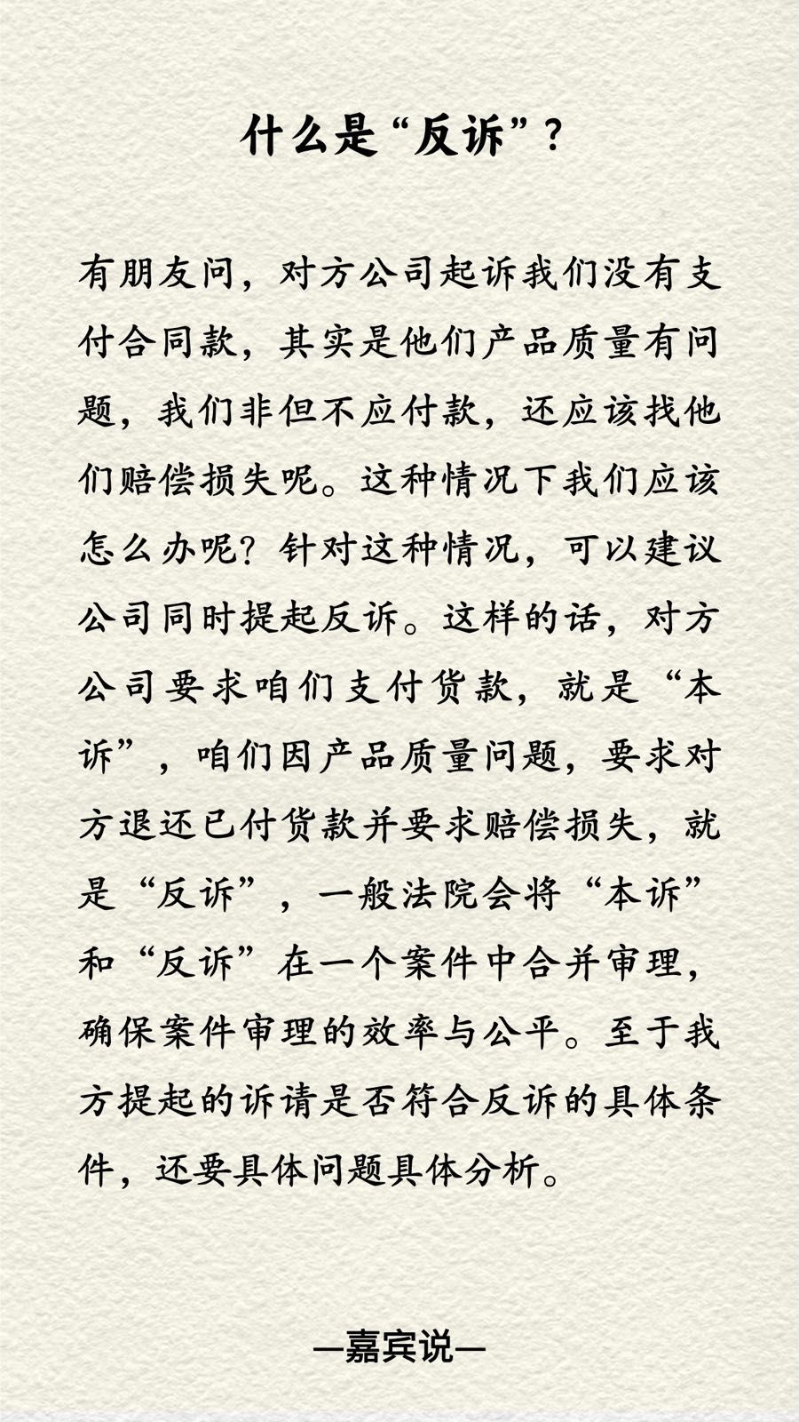 有朋友问,对方公司起诉我们没有支付合同款,其实是他们产品质量有问题,我们非但不应付款,还应该找他们赔偿损失呢。这种情况下我们应该怎么办呢?针对这种情况,可以建议公司同时提起反诉。这样的话,对方公司要求咱们支付货款,就是“本诉”,咱们因产品质量问题,要求对方退还已付货款并要求赔偿损失,就是“反诉”,一般法院会将“本诉”和“反诉”在一个案件中合并审理,确保案件审理的效率与公平。至于我方提起的诉请是否符合反诉的具体条件,还要具体问题具体分析。