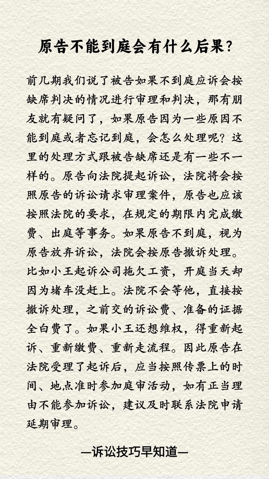 前几期我们说了被告如果不到庭应诉会按缺席判决的情况进行审理和判决,那有朋友就有疑问了,如果原告因为一些原因不能到庭或者忘记到庭,会怎么处理呢?这里的处理方式跟被告缺席还是有一些不一样的。原告向法院提起诉讼,法院将会按照原告的诉讼请求审理案件,原告也应该按照法院的要求,在规定的期限内完成缴费、出庭等事务。如果原告不到庭,视为原告放弃诉讼,法院会按原告撤诉处理。比如小王起诉公司拖欠工资,开庭当天却因为堵车没赶上。法院不会等他,直接按撤诉处理,之前交的诉讼费、准备的证据全白费了。如果小王还想维权,得重新起诉、重新缴费、重新走流程。因此原告在法院受理了起诉后,应当按照传票上的时间、地点准时参加庭审活动,如有正当理由不能参加诉讼,建议及时联系法院申请延期审理。