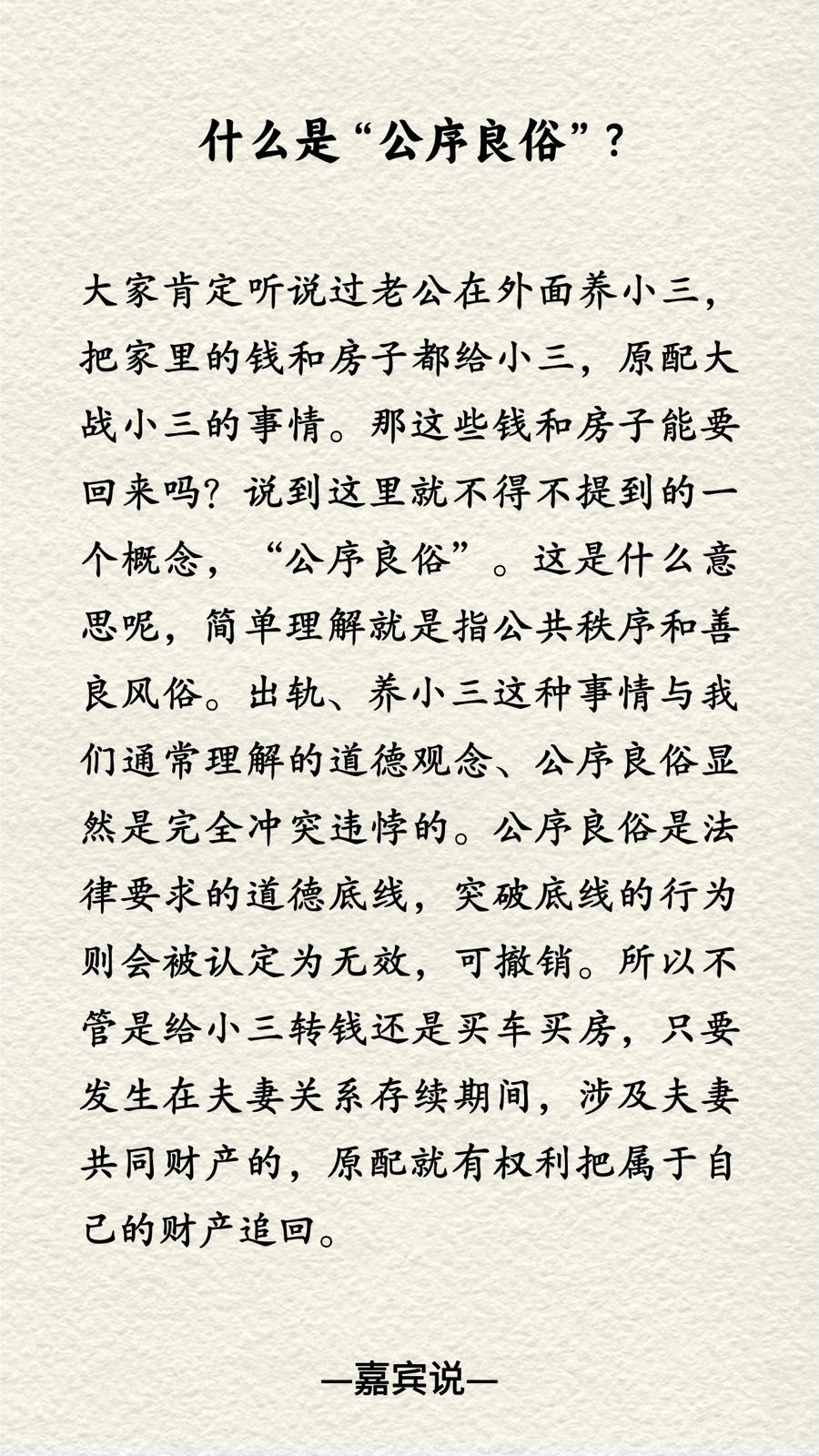 大家肯定听说过老公在外面养小三,把家里的钱和房子都给小三,原配大战小三的事情。那这些钱和房子能要回来吗?说到这里就不得不提到的一个概念,“公序良俗”。这是什么意思呢,简单理解就是指公共秩序和善良风俗。出轨、养小三这种事情与我们通常理解的道德观念、公序良俗显然是完全冲突违悖的。公序良俗是法律要求的道德底线,突破底线的行为则会被认定为无效,可撤销。所以不管是给小三转钱还是买车买房,只要发生在夫妻关系存续期间,涉及夫妻共同财产的,原配就有权利把属于自己的财产追回。