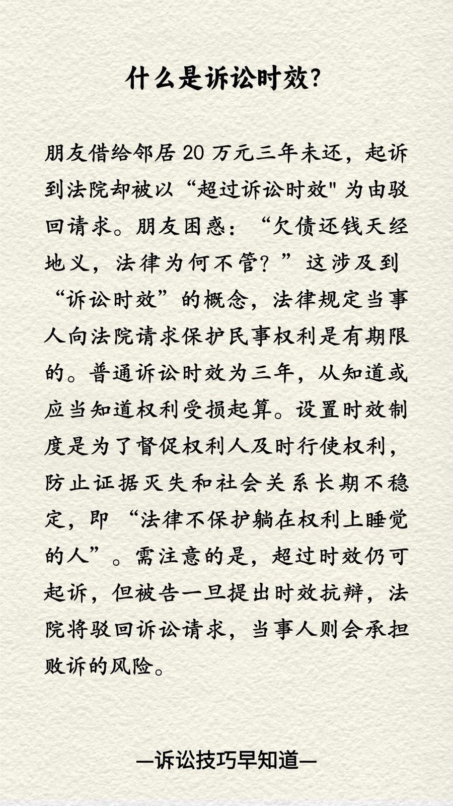 朋友借给邻居 20 万元三年未还,起诉到法院却被以“超过诉讼时效" 为由驳回请求。朋友困惑:“欠债还钱天经地义,法律为何不管?”这涉及到 “诉讼时效”的概念,法律规定当事人向法院请求保护民事权利是有期限的。普通诉讼时效为三年,从知道或应当知道权利受损起算。设置时效制度是为了督促权利人及时行使权利,防止证据灭失和社会关系长期不稳定,即 “法律不保护躺在权利上睡觉的人”。需注意的是,超过时效仍可起诉,但被告一旦提出时效抗辩,法院将驳回诉讼请求,当事人则会承担败诉的风险。