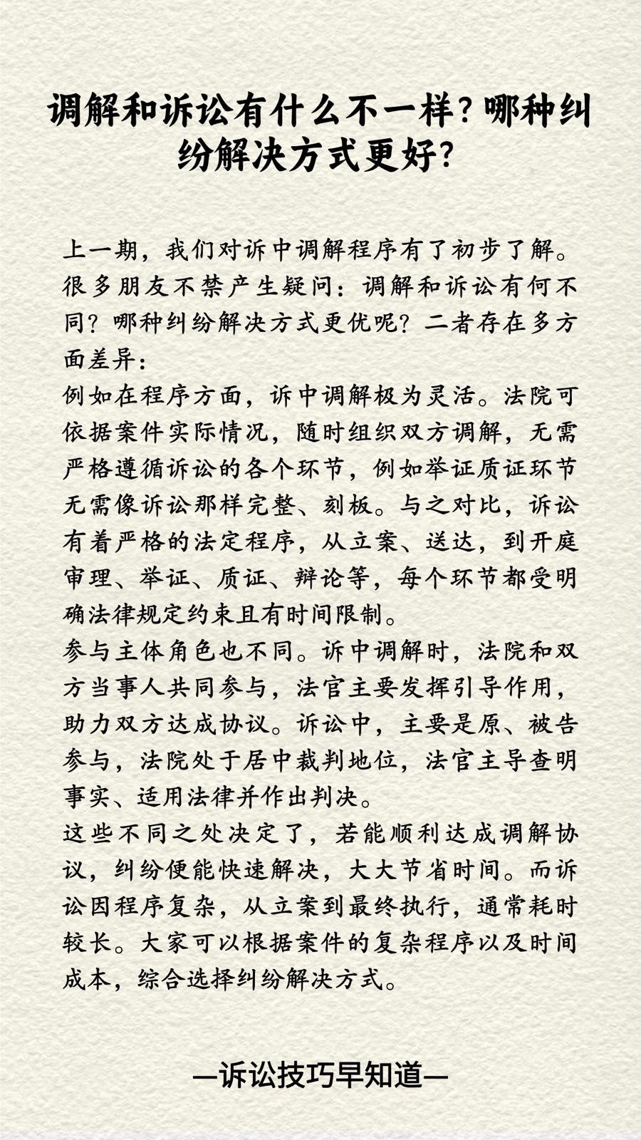 上一期,我们对诉中调解程序有了初步了解。很多朋友不禁产生疑问:调解和诉讼有何不同?哪种纠纷解决方式更优呢?二者存在多方面差异: