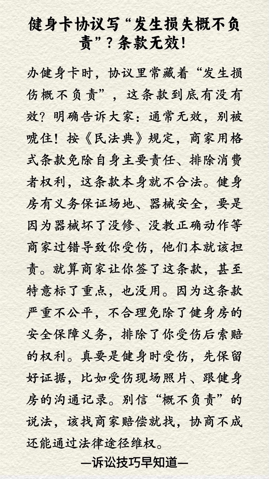 诉讼技巧早知道108|健身卡协议写“发生损失概不负责”?条款