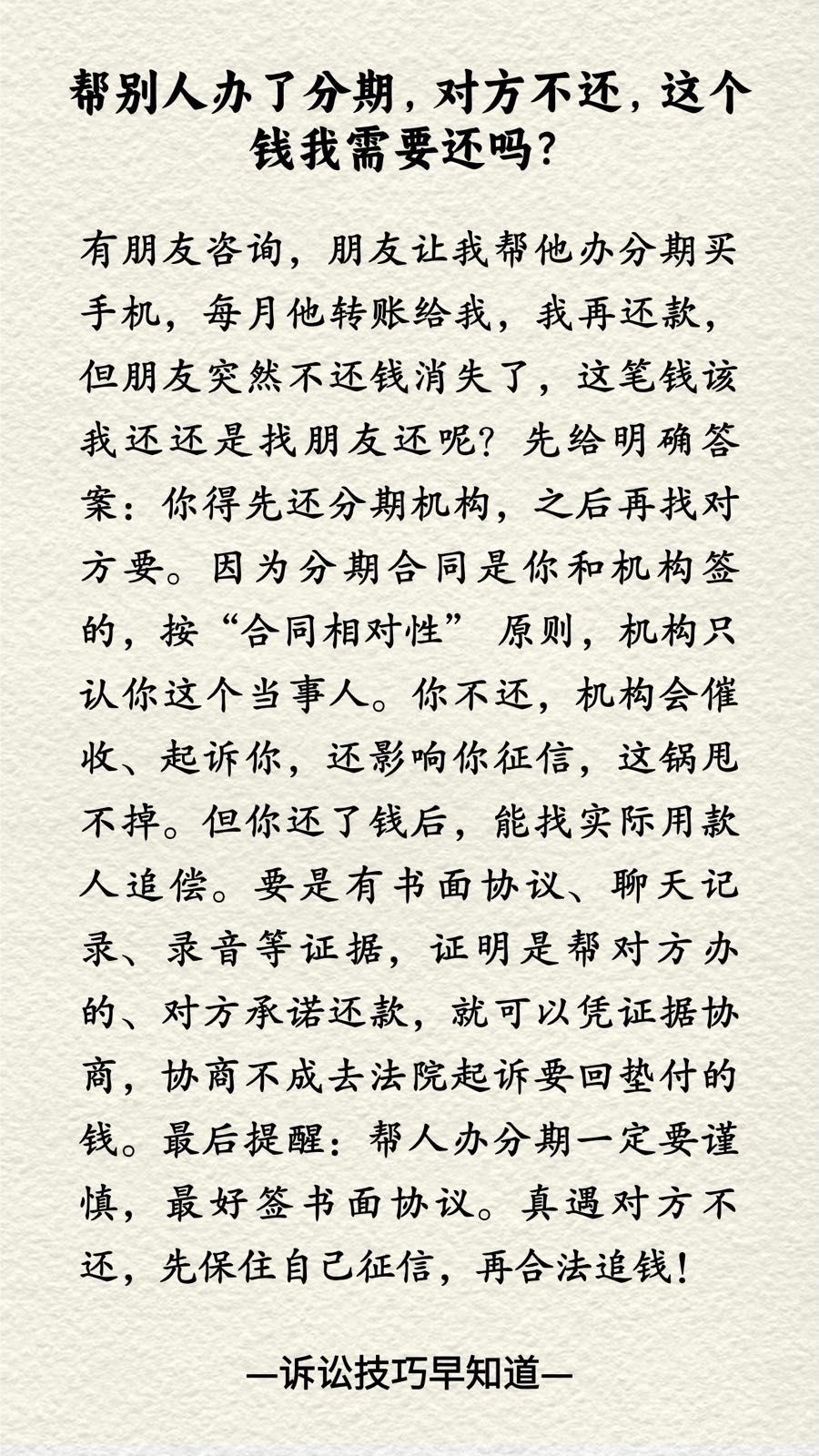 有朋友咨询,朋友让我帮他办分期买手机,每月他转账给我,我再还款,但朋友突然不还钱消失了,这笔钱该我还还是找朋友还呢?先给明确答案:你得先还分期机构,之后再找对方要。因为分期合同是你和机构签的,按“合同相对性” 原则,机构只认你这个当事人。你不还,机构会催收、起诉你,还影响你征信,这锅甩不掉。但你还了钱后,能找实际用款人追偿。要是有书面协议、聊天记录、录音等证据,证明是帮对方办的、对方承诺还款,就可以凭证据协商,协商不成去法院起诉要回垫付的钱。最后提醒:帮人办分期一定要谨慎,最好签书面协议。真遇对方不还,先保住自己征信,再合法追钱!