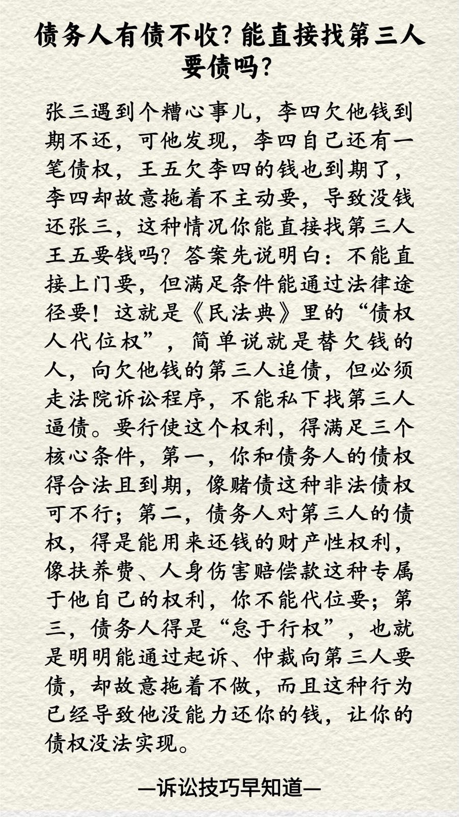 张三遇到个糟心事儿,李四欠他钱到期不还,可他发现,李四自己还有一笔债权,王五欠李四的钱也到期了,李四却故意拖着不主动要,导致没钱还张三,这种情况你能直接找第三人王五要钱吗?答案先说明白:不能直接上门要,但满足条件能通过法律途径要!这就是《民法典》里的“债权人代位权”,简单说就是替欠钱的人,向欠他钱的第三人追债,但必须走法院诉讼程序,不能私下找第三人逼债。要行使这个权利,得满足三个核心条件,第一,你和债务人的债权得合法且到期,像赌债这种非法债权可不行;第二,债务人对第三人的债权,得是能用来还钱的财产性权利,像扶养费、人身伤害赔偿款这种专属于他自己的权利,你不能代位要;第三,债务人得是“怠于行权”,也就是明明能通过起诉、仲裁向第三人要债,却故意拖着不做,而且这种行为已经导致他没能力还你的钱,让你的债权没法实现。