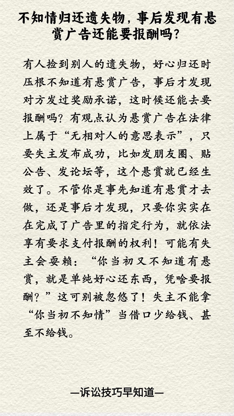 诉讼技巧早知道148|不知情归还遗失物,事后发现有悬赏广告还