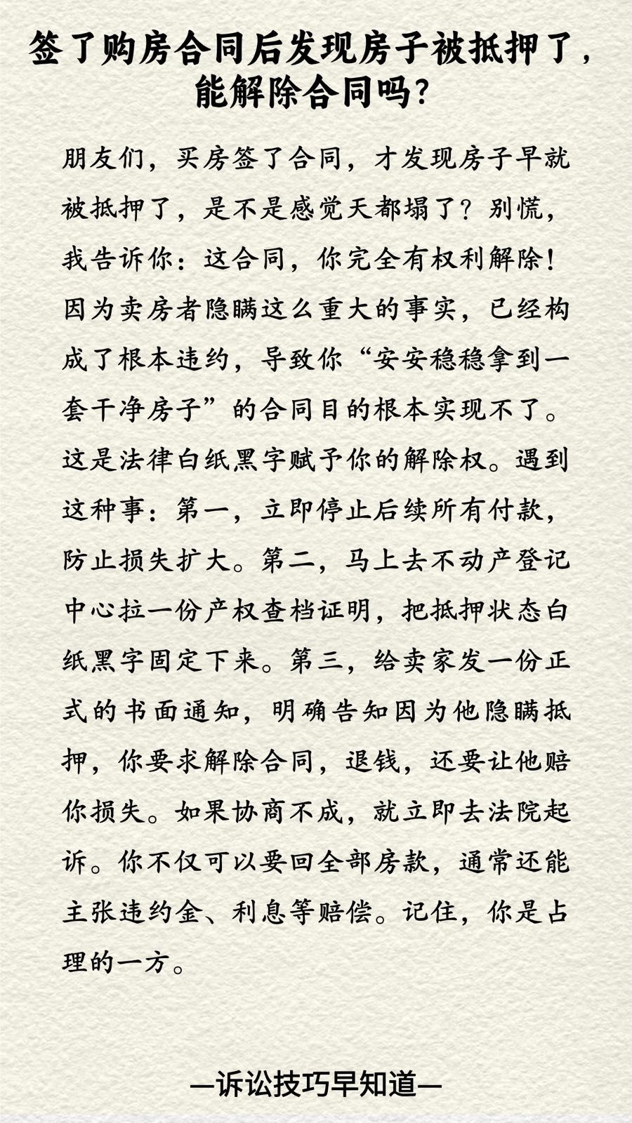 朋友们,买房签了合同,才发现房子早就被抵押了,是不是感觉天都塌了?别慌,我告诉你:这合同,你完全有权利解除!因为卖房者隐瞒这么重大的事实,已经构成了根本违约,导致你“安安稳稳拿到一套干净房子”的合同目的根本实现不了。这是法律白纸黑字赋予你的解除权。遇到这种事:第一,立即停止后续所有付款,防止损失扩大。第二,马上去不动产登记中心拉一份产权查档证明,把抵押状态白纸黑字固定下来。第三,给卖家发一份正式的书面通知,明确告知因为他隐瞒抵押,你要求解除合同,退钱,还要让他赔你损失。如果协商不成,就立即去法院起诉。你不仅可以要回全部房款,通常还能主张违约金、利息等赔偿。记住,你是占理的一方。