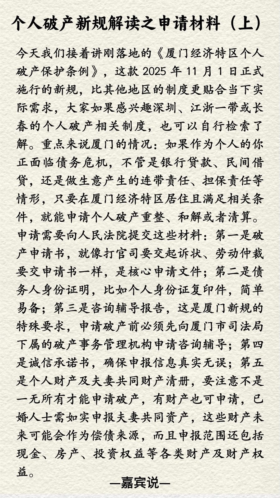 今天我们接着讲刚落地的《厦门经济特区个人破产保护条例》,这款 2025 年 11 月 1 日正式施行的新规,比其他地区的制度更贴合当下实际需求,大家如果感兴趣深圳、江浙一带或长春的个人破产相关制度,也可以自行检索了解。重点来说厦门的情况:如果作为个人的你正面临债务危机,不管是银行贷款、民间借贷,还是做生意产生的连带责任、担保责任等情形,只要在厦门经济特区居住且满足相关条件,就能申请个人破产重整、和解或者清算。申请需要向人民法院提交这些材料:第一是破产申请书,就像打官司要交起诉状、劳动仲裁要交申请书一样,是核心申请文件;第二是债务人身份证明,比如个人身份证复印件,简单易备;第三是咨询辅导报告,这是厦门新规的特殊要求,申请破产前必须先向厦门市司法局下属的破产事务管理机构申请咨询辅导;第四是诚信承诺书,确保申报信息真实无误;第五是个人财产及夫妻共同财产清册,要注意不是一无所有才能申请破产,有财产也可申请,已婚人士需如实申报夫妻共同资产,这些财产未来可能会作为偿债来源,而且申报范围还包括现金、房产、投资权益等各类财产及财产权益。