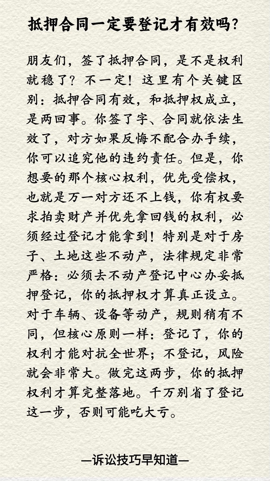 朋友们,签了抵押合同,是不是权利就稳了?不一定!这里有个关键区别:抵押合同有效,和抵押权成立,是两回事。你签了字、合同就依法生效了,对方如果反悔不配合办手续,你可以追究他的违约责任。但是,你想要的那个核心权利,优先受偿权,也就是万一对方还不上钱,你有权要求拍卖财产并优先拿回钱的权利,必须经过登记才能拿到!特别是对于房子、土地这些不动产,法律规定非常严格:必须去不动产登记中心办妥抵押登记,你的抵押权才算真正设立。对于车辆、设备等动产,规则稍有不同,但核心原则一样:登记了,你的权利才能对抗全世界;不登记,风险就会非常大。做完这两步,你的抵押权利才算完整落地。千万别省了登记这一步,否则可能吃大亏。