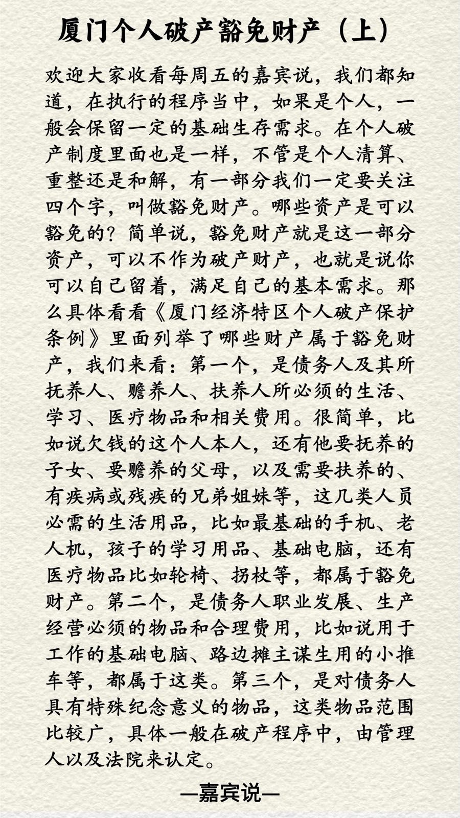 欢迎大家收看每周五的嘉宾说,我们都知道,在执行的程序当中,如果是个人,一般会保留一定的基础生存需求。在个人破产制度里面也是一样,不管是个人清算、重整还是和解,有一部分我们一定要关注四个字,叫做豁免财产。哪些资产是可以豁免的?简单说,豁免财产就是这一部分资产,可以不作为破产财产,也就是说你可以自己留着,满足自己的基本需求。那么具体看看《厦门经济特区个人破产保护条例》里面列举了哪些财产属于豁免财产,我们来看:第一个,是债务人及其所抚养人、赡养人、扶养人所必须的生活、学习、医疗物品和相关费用。很简单,比如说欠钱的这个人本人,还有他要抚养的子女、要赡养的父母,以及需要扶养的、有疾病或残疾的兄弟姐妹等,这几类人员必需的生活用品,比如最基础的手机、老人机,孩子的学习用品、基础电脑,还有医疗物品比如轮椅、拐杖等,都属于豁免财产。第二个,是债务人职业发展、生产经营必须的物品和合理费用,比如说用于工作的基础电脑、路边摊主谋生用的小推车等,都属于这类。第三个,是对债务人具有特殊纪念意义的物品,这类物品范围比较广,具体一般在破产程序中,由管理人以及法院来认定。