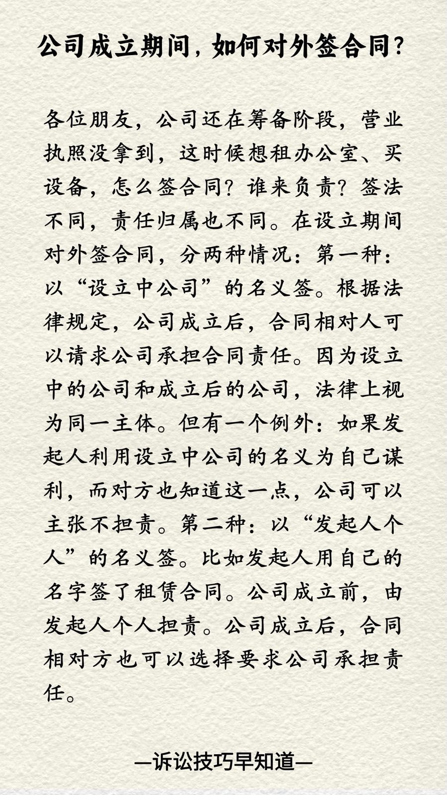 各位朋友,公司还在筹备阶段,营业执照没拿到,这时候想租办公室、买设备,怎么签合同?谁来负责?签法不同,责任归属也不同。在设立期间对外签合同,分两种情况:第一种:以“设立中公司”的名义签。根据法律规定,公司成立后,合同相对人可以请求公司承担合同责任。因为设立中的公司和成立后的公司,法律上视为同一主体。但有一个例外:如果发起人利用设立中公司的名义为自己谋利,而对方也知道这一点,公司可以主张不担责。第二种:以“发起人个人”的名义签。比如发起人用自己的名字签了租赁合同。公司成立前,由发起人个人担责。公司成立后,合同相对方也可以选择要求公司承担责任。