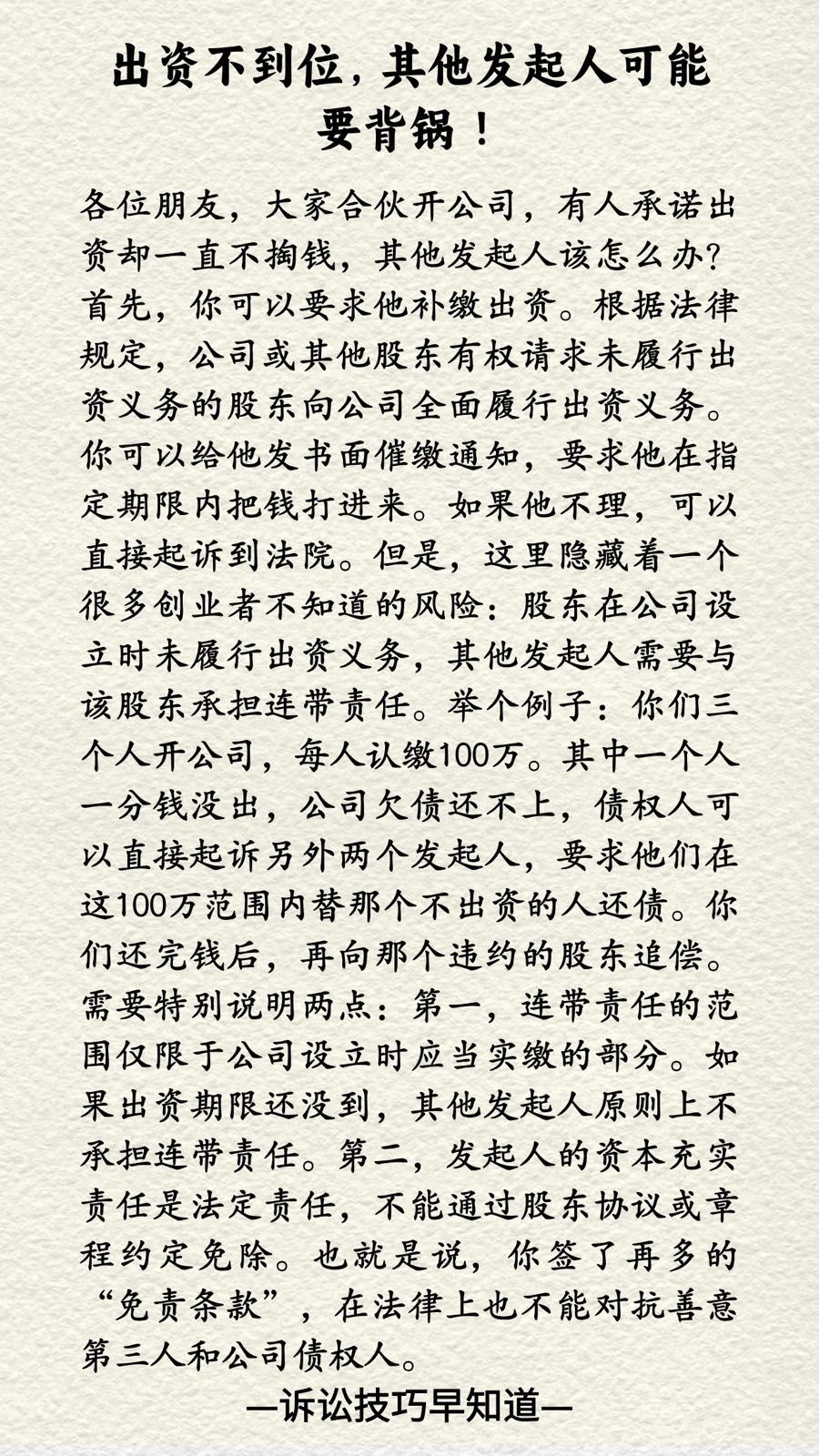 各位朋友,大家合伙开公司,有人承诺出资却一直不掏钱,其他发起人该怎么办?首先,你可以要求他补缴出资。根据法律规定,公司或其他股东有权请求未履行出资义务的股东向公司全面履行出资义务。你可以给他发书面催缴通知,要求他在指定期限内把钱打进来。如果他不理,可以直接起诉到法院。但是,这里隐藏着一个很多创业者不知道的风险:股东在公司设立时未履行出资义务,其他发起人需要与该股东承担连带责任。举个例子:你们三个人开公司,每人认缴100万。其中一个人一分钱没出,公司欠债还不上,债权人可以直接起诉另外两个发起人,要求他们在这100万范围内替那个不出资的人还债。你们还完钱后,再向那个违约的股东追偿。需要特别说明两点:第一,连带责任的范围仅限于公司设立时应当实缴的部分。如果出资期限还没到,其他发起人原则上不承担连带责任。第二,发起人的资本充实责任是法定责任,不能通过股东协议或章程约定免除。也就是说,你签了再多的“免责条款”,在法律上也不能对抗善意第三人和公司债权人。