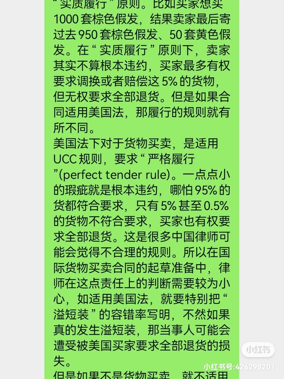 在中国法项下,买卖合同的履行其实是适用“实质履行”原则。比如买家想买1000套棕色假发,结果卖家最后寄过去950套棕色假发、50套黄色假发。在“实质履行”原则下,卖家其实不算根本违约,买家最多有权要求调换或者赔偿这5%的货物,但无权要求全部退货。但是如果合同适用美国法,那履行的规则就有所不同。