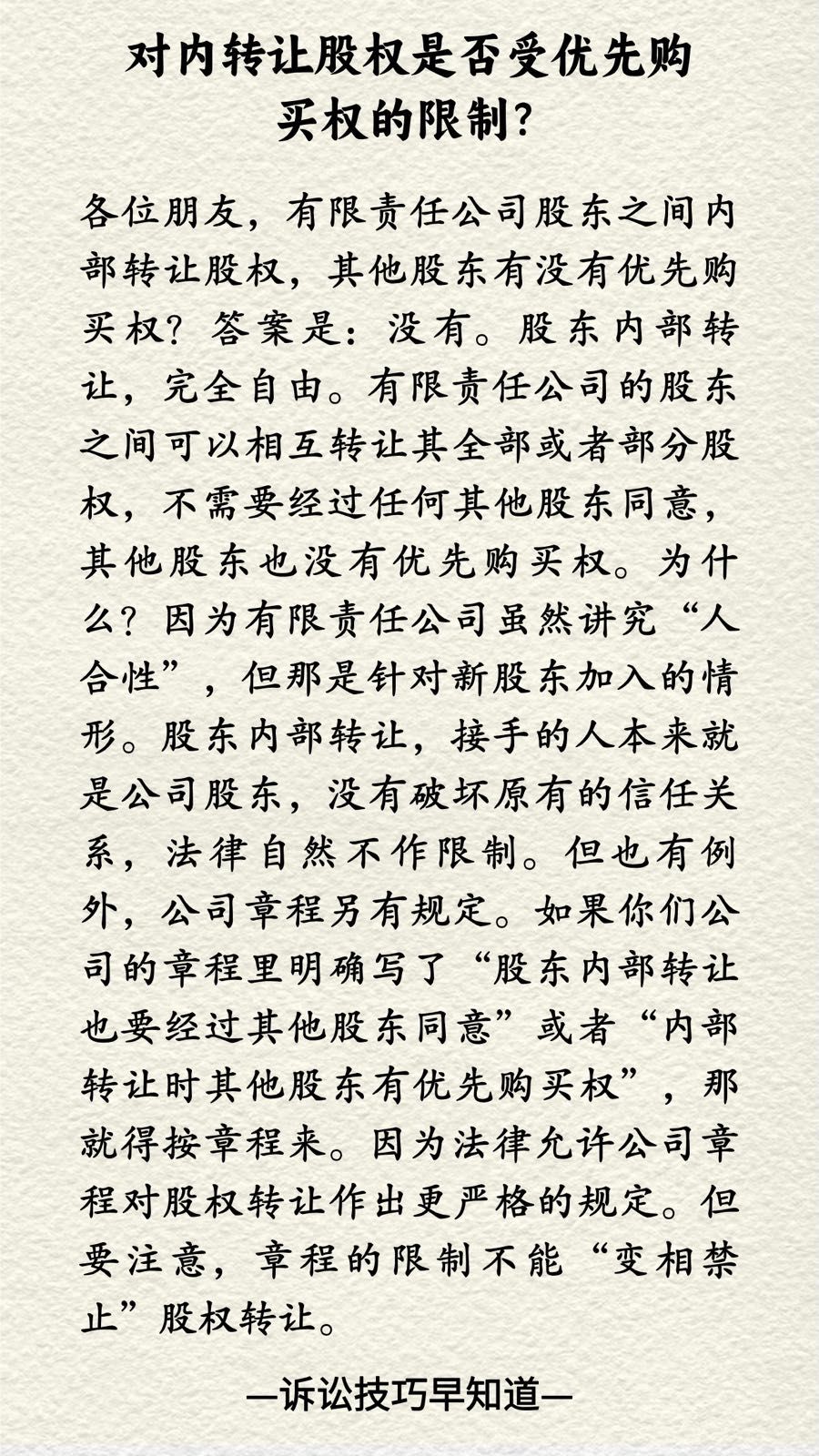 0诉讼技巧早知道199|对内转让股权是否受优先购买权的限制?